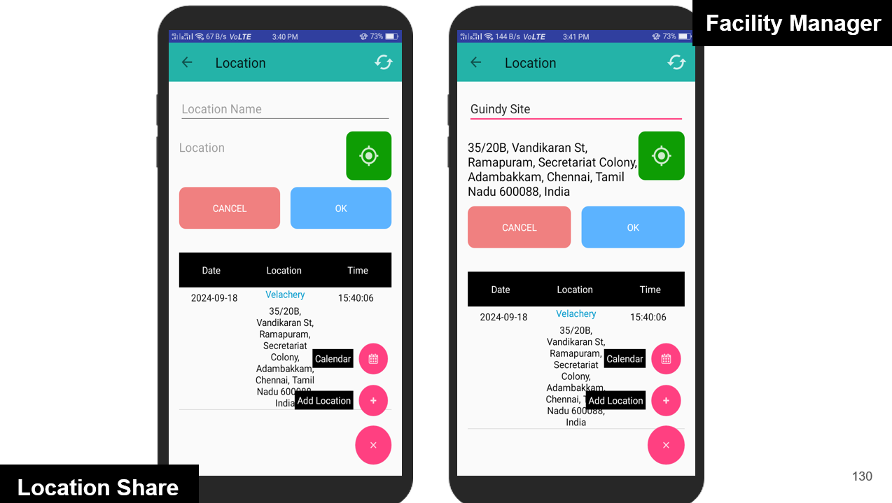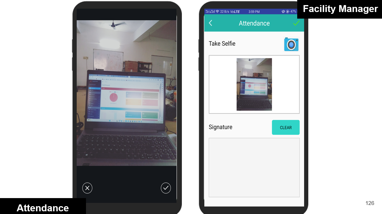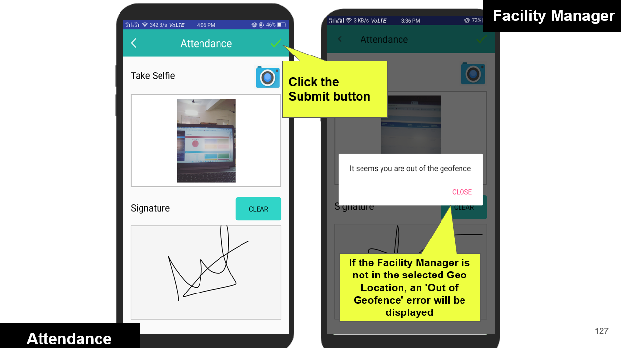 Facility Managers can conveniently mark their attendance by checking in and out directly from the mobile app. Each check-in/out is validated against the predefined geofence to ensure the manager is within the designated work location. If the geofence condition is not met, the system immediately alerts the user with a warning.