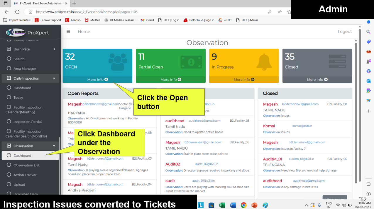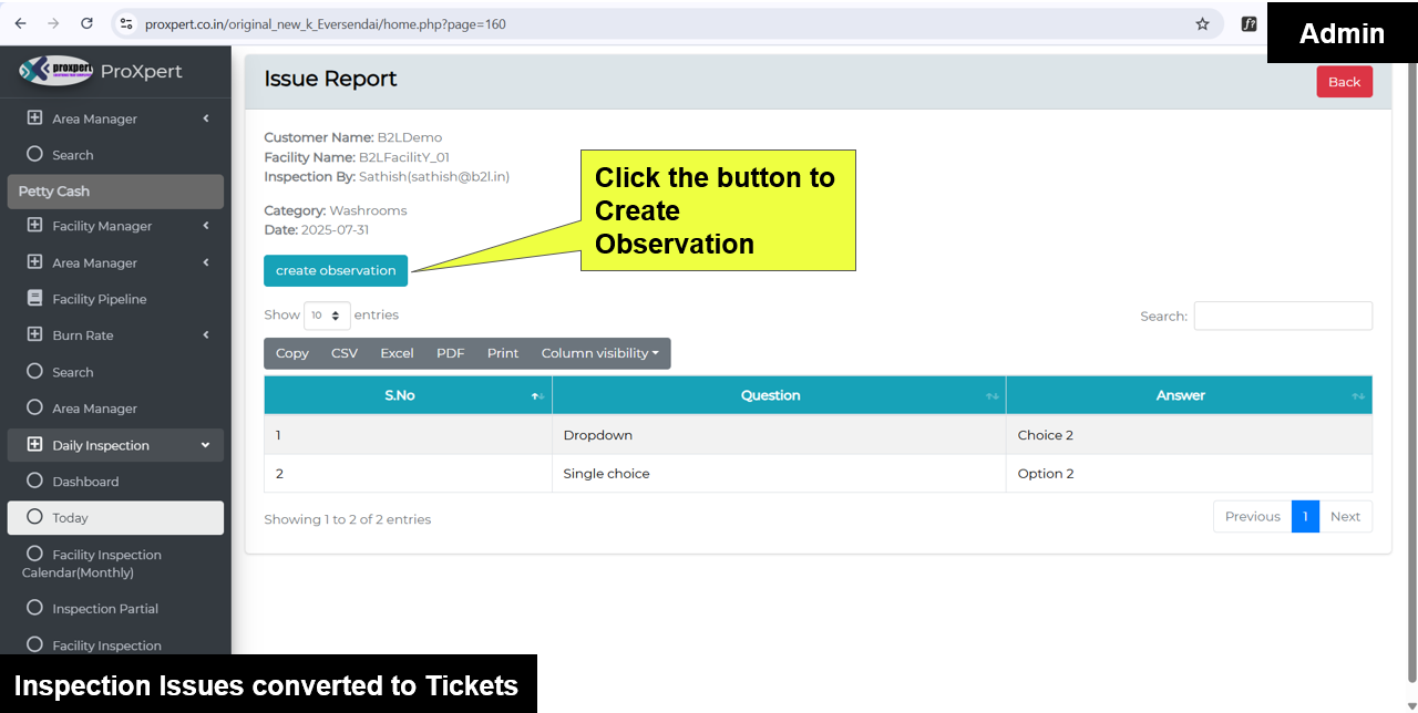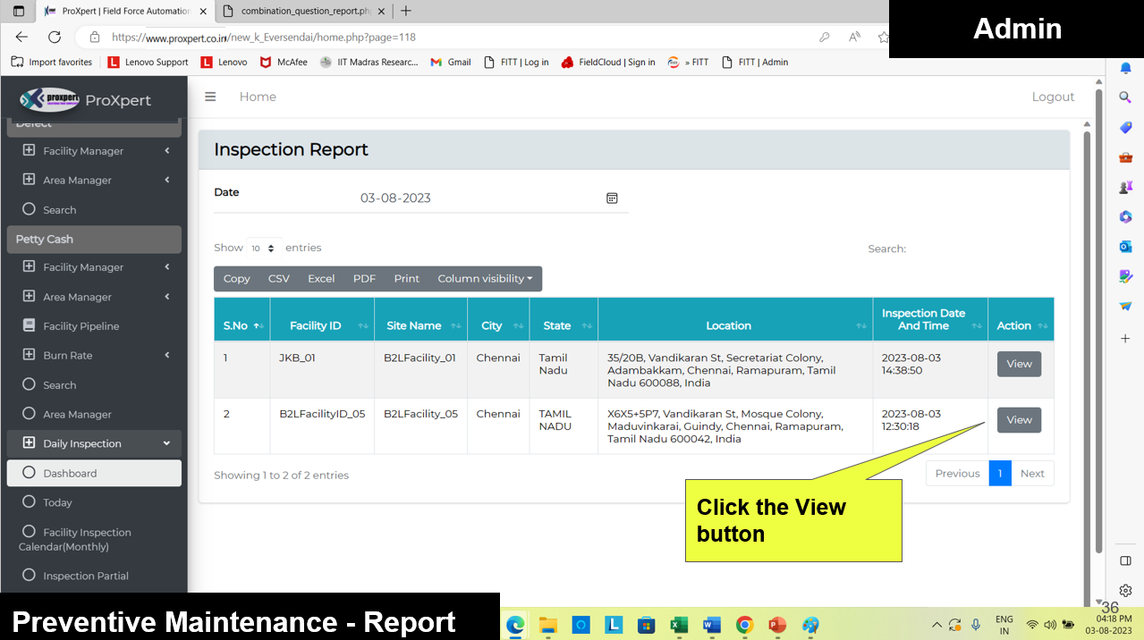 Once Inspection form is Submitted by Field manager, the admin can view the Inspection Reports at backend console.
