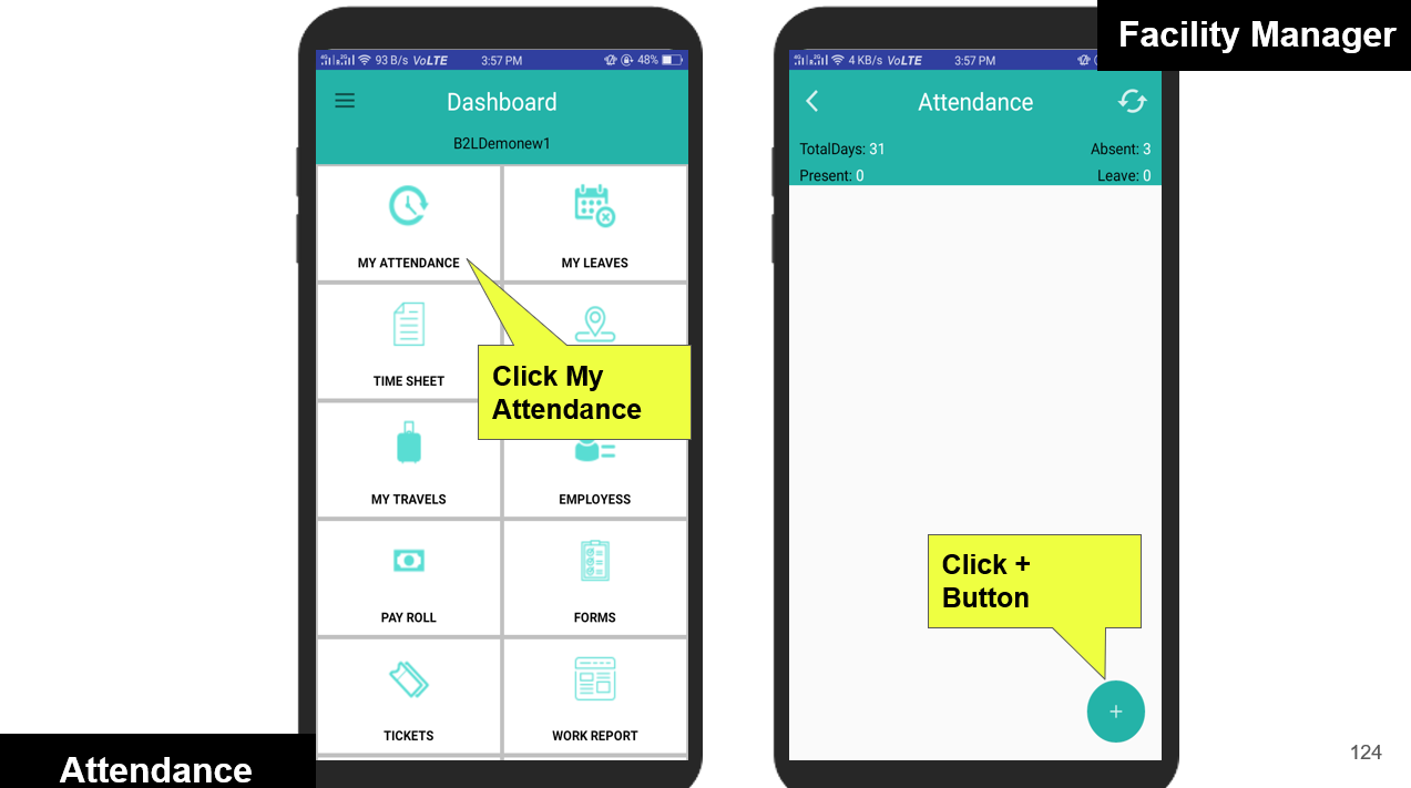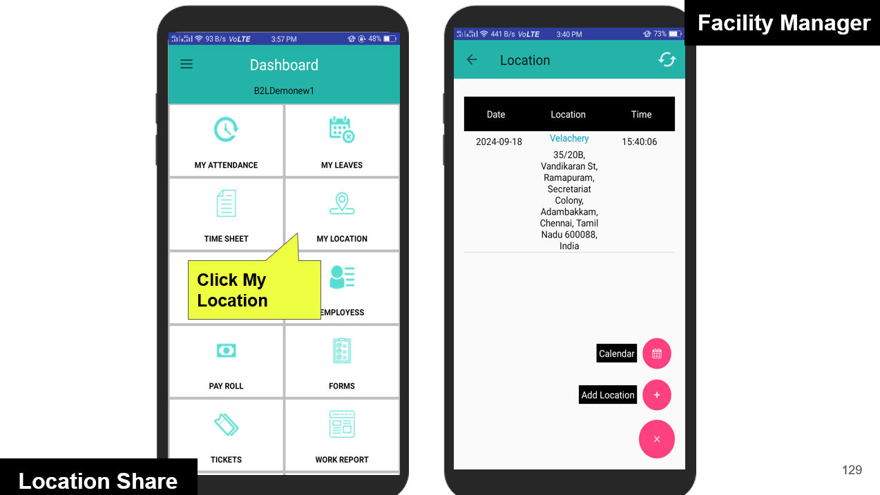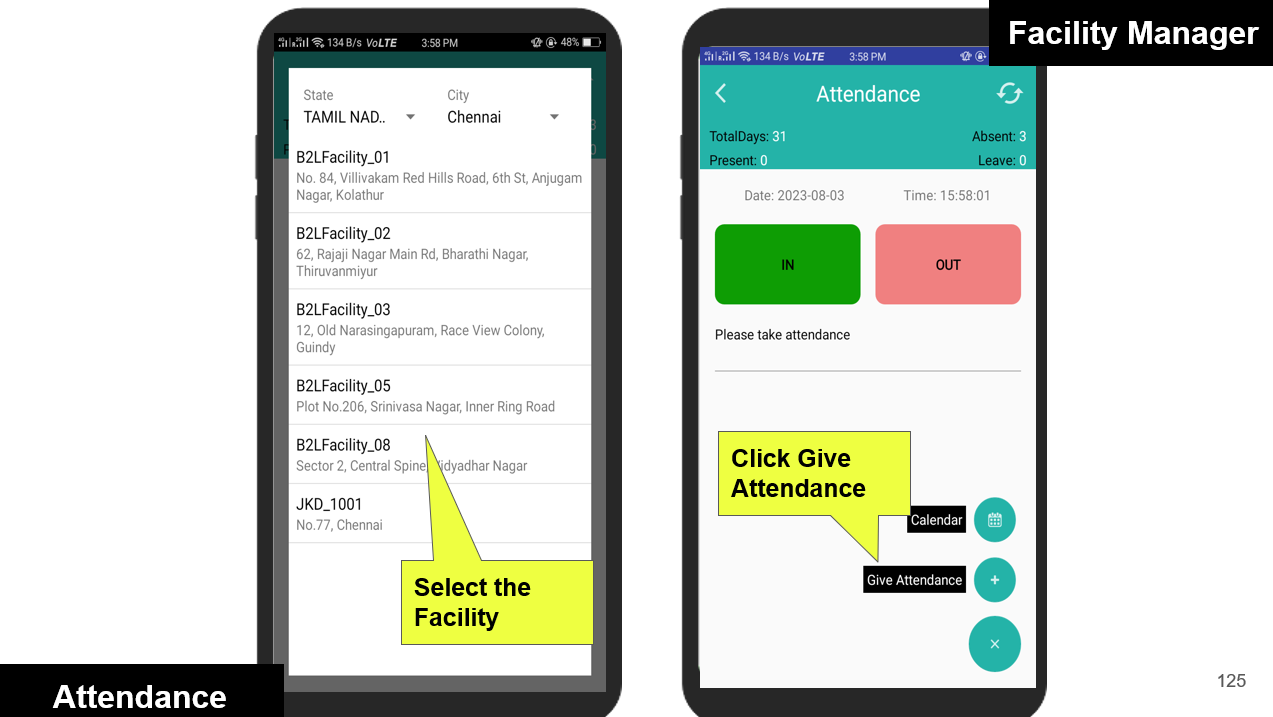 Facility Managers can conveniently mark their attendance by checking in and out directly from the mobile app. Each check-in/out is validated against the predefined geofence to ensure the manager is within the designated work location. If the geofence condition is not met, the system immediately alerts the user with a warning.