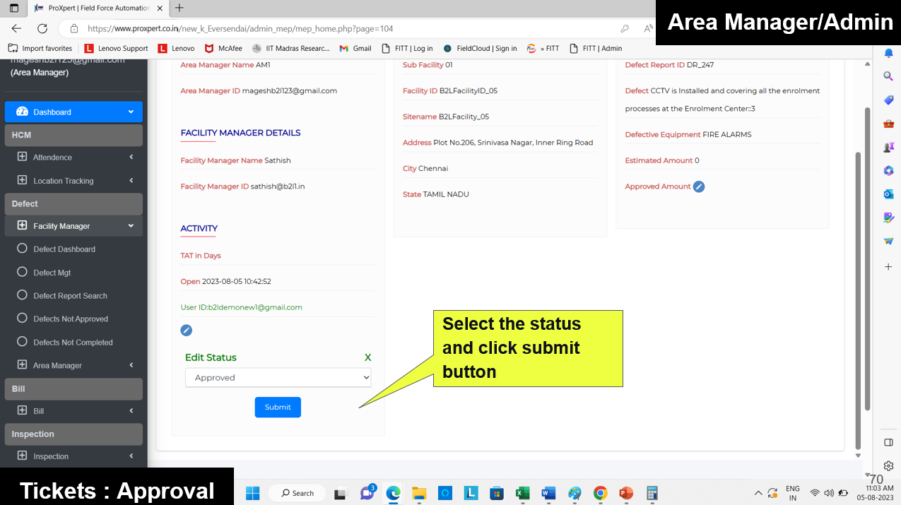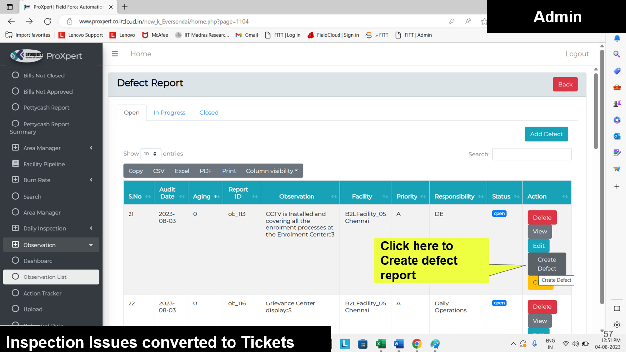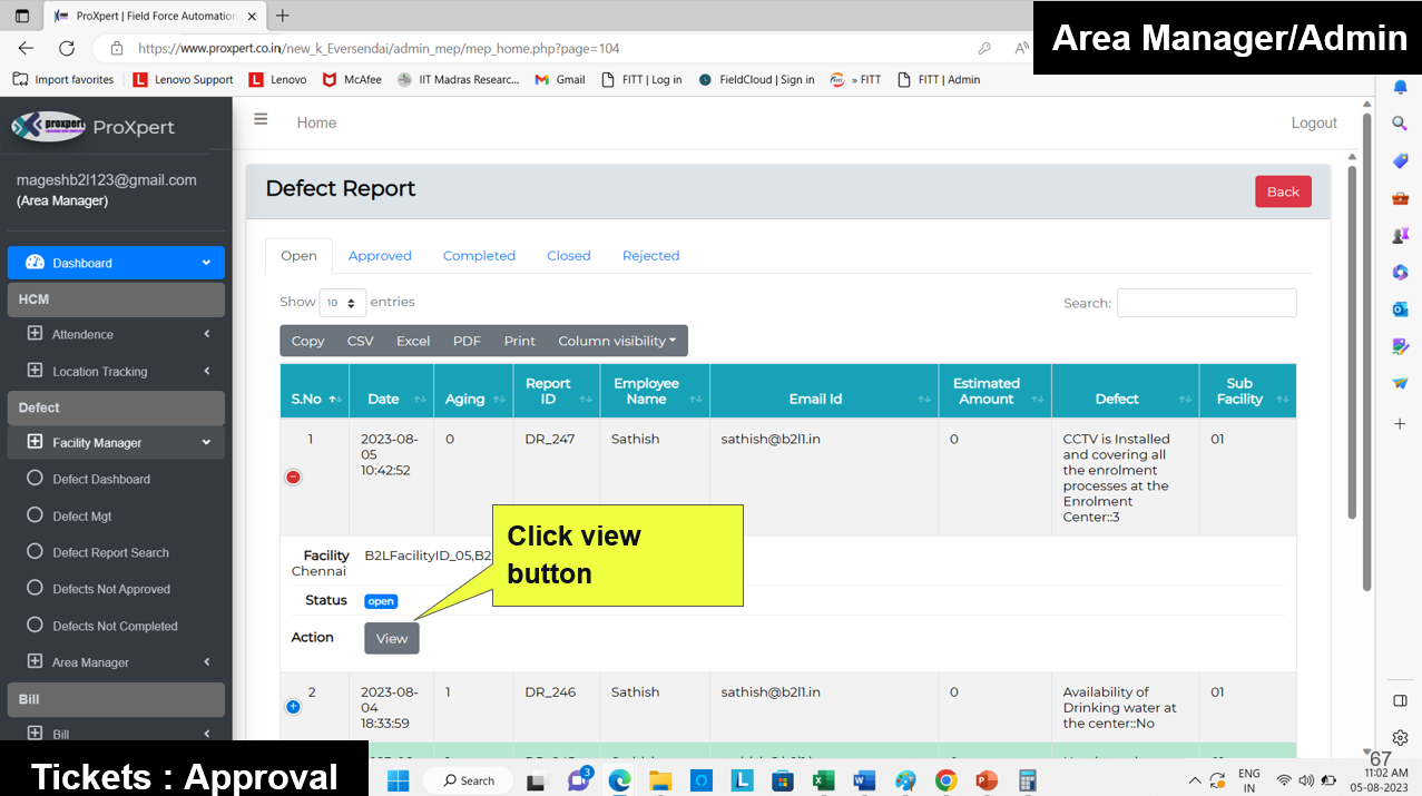 Once the Defect Report is submitted by the Field Manager, it becomes visible in the Admin and Area Manager consoles, where they can either approve or reject the defect.