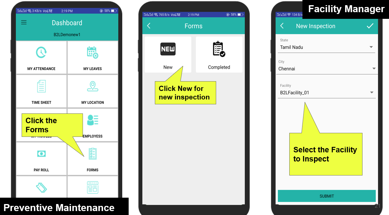After the completion of Preventive Maintenance/Inspection by the Facility Manager, if there are any issues, they can be converted into tickets, assigned to the Facility Manager, and then they can address and close those tickets.